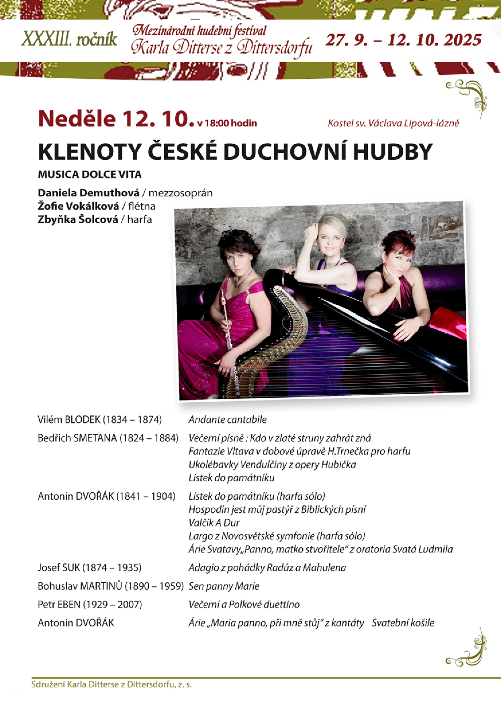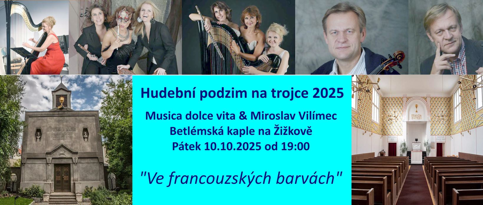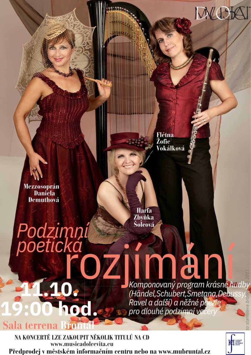 Vítejte na webových stránkách harfistky Zbyňky ŠolcovéPočet návštěvníků stránek od 5.5.2015 jeNejbližší koncerty:V neděli 12.10.2025 vystoupí Zbyňka Šolcová s triem Musica dolce vita od 18:00 v prostorách kostela Sv. Václava v Lipová-lázních v rámci XXXIII ročníku mezinárodního hudebního festivalu Karla Ditterse z Dittersdorfu s koncertním programem "Klenoty české duchovní hudby". Program koncertu je sestaven ze skladeb slavných českých mistrů.Program: Vilém BLODEK (1834 – 1874) Andante cantabile Bedřich SMETANA (1824 – 1884) Večerní písně : Kdo v zlaté struny zahrát zná Bedřich SMETANA (1824 – 1884) Fantazie Vltava v dobové úpravě H.Trnečka pro harfu Bedřich SMETANA (1824 – 1884) Ukolébavky Vendulčiny z opery Hubička Antonín DVOŘÁK (1841 – 1904) Lístek do památníku (harfa sólo) Antonín DVOŘÁK (1841 – 1904) Hospodin jest můj pastýř z Biblických písní Antonín DVOŘÁK (1841 – 1904) Valčík A Dur Antonín DVOŘÁK (1841 – 1904) Árie Svatavy „Panno, matko stvořitele“ z oratoria Svatá Ludmila Josef SUK (1874 – 1935) Adagio z pohádky Radúz a Mahulena Bohuslav MARTINŮ (1890 – 1959) Sen panny Marie Petr EBEN (1929 – 2007) Večerní a Polkové duettino Antonín DVOŘÁK (1841 – 1904) Árie „ Maria panno, při mně stůj“ z kantáty Svatební košile ![]() ![]() Stalo se ...Musica dolce vita - Podzimní poetická rozjímání v BruntáleV sobotu 11.10.2025 vystoupila Zbyňka Šolcová s triem Musica dolce vita od 19:00 v historických prostorách Sala terreny v Bruntále s komponovaným programem sestaveným z hudby známých světových mistrů a poezie Zbyňky Šolcové s názvem Podzimní poetická rozjímání. Krásné skladby inspirované podzimem a jeho poklidnou atmosférou bude doplňovat milostná poezie protagonistky koncertu, harfistky Zbyňky Šolcové.Na koncertě bude možné zakoupit i autorské CD Zbyňky Šolcové s názvem "Dík...", které obsahuje celkem 12 skladeb a 14 básní skvěle přednesených známou českou herečkou a dabérkou paní Jarmilou Švehlovou. Zbyňku Šolcovou tak na CD můžete poznat jako autorku hudby, interpretku vlastních skladeb, básnířku i fotografku. Jedná se o hudebně poetický zážitek, který pohladí na duši a přináší posluchači klid a pohodu. PROGRAM KONCERTU: Antonio VIVALDI - Podzim ze Čtvero ročních dob Antonio VIVALDI - Árie z oratoria Juditha triumhans Jean Baptist CARDON - Sonáta f moll pro harfu Marin MARAIS - Le Basque Giovanni PAISIELLO - Arietta „Nel cor piú non mi sento“ Johann Sebastian BACH - Menuet a Badinerie ze svity h moll W. Amadeus MOZART - Árie „Komm, liebe Zither“ KV 367 Fryderyk CHOPIN - Variace na Rossiniho téma Franz SCHUBERT - Zastaveníčko Zbyňka ŠOLCOVÁ - Láska v dešti Claude DEBUSSY - Syrinx pro flétnu sólo Edvard GRIEG - Solveigina píseň Deborah HENSON - CONANT - Baroque flamenco Jaques IBERT - Entre act Pauline VIARDOT - La barque de l’amour ![]() Koncert tria Musica dolce vita v Malé Betlémské kapli v PrazeV pátek 10.10.2025 vystoupila Zbyňka Šolcová s triem Musica dolce vita od 19:00 v Malé Betlémské kapli v Praze na Žižkově v rámci koncertního cyklu Hudební podzim na trojce 2025. Na programu večera byly skladby známých francouzských skladatelů z období romantismu a impresionismu, ke kterým patří Massenet, Ravel, Franck, Debussy a další Výběru skladeb odpovídalo i oblečení tria ve francouzských barvách. Jako host tria vystoupil umělecký ambasador Hudebního podzimu, známý český houslista a koncertní mistr České filharmonie Miroslav Vilímec.![]() Koncert tria Musica dolce vita a Klenoty české hudby v KroměřížiV úterý 30.9.2025 vystoupila Zbyňka Šolcová s triem Musica dolce vita od 19:00 hod v klubu Starý pivovar v Kroměříži. Program KLENOTY ČESKÉ HUDBY byl sestaven ze skladeb největších českých skladatelů, jejichž hudba neztratila ani po desetiletích nic ze své krásy a působivosti. Program Klenoty české hudby se stal nejúspěšnějším titulem souboru a byl vydán také na stejnojmenném albu (viz sekce "Ukázky"). „Rády bychom tímto koncertem vzdaly hold umění a památce našich největších skladatelů, neboť věříme, že jejich hudba ani po desetiletích neztratila nic na své kráse a působivosti. Jsme přesvědčeny, že tento koktejl nejkrásnějších skladeb českých skladatelů potěší i další posluchače ve všech koutech naší vlasti,“ říkají o programu členky tria Musica Dolce Vita.PROGRAM KONCERTU: Vilém BLODEK (1834 – 1874): Andante cantabile František ŠKROUP (1801 – 1862): Děvy slovanské Bedřich SMETANA (1824 – 1884: Luisina polka Bedřich SMETANA (1824 – 1884): Fantazie Vltava v dobové úpravě Hanuše Trnečka pro harfu sólo Bedřich SMETANA (1824 – 1884): Jiřinková polka Bohuslav MARTINŮ (1890 – 1959): Děvče z Moravy Antonín DVOŘÁK (1841 – 1904): Valčík D dur Antonín DVOŘÁK (1841 – 1904): Largo z Novosvětské symfonie (harfa sólo) Antonín DVOŘÁK (1841 – 1904): Žalo dievča, žalo trávu Antonín DVOŘÁK (1841 – 1904): Humoreska Antonín DVOŘÁK (1841 – 1904): Cigánské melodie : Když mne stará matka Josef SUK (1874 – 1935): Adagio z pohádky Radúz a Mahulena Leoš JANÁČEK (1854 – 1928): Moravská lidová poezie v písních ![]() Musica dolce vita - Podzimní poetická rozjímání v SedlčanechVe středu 24.9.2025 vystoupila Zbyňka Šolcová s triem Musica dolce vita od 19:30 v koncertním sále kulturního domu v Sedlčanech s komponovaným programem sestaveným z hudby známých světových mistrů a poezie Zbyňky Šolcové s názvem Podzimní poetická rozjímání. Krásné skladby inspirované podzimem a jeho poklidnou atmosférou bude doplňovat milostná poezie protagonistky koncertu, harfistky Zbyňky Šolcové.Na koncertě bylo možné zakoupit i autorské CD Zbyňky Šol