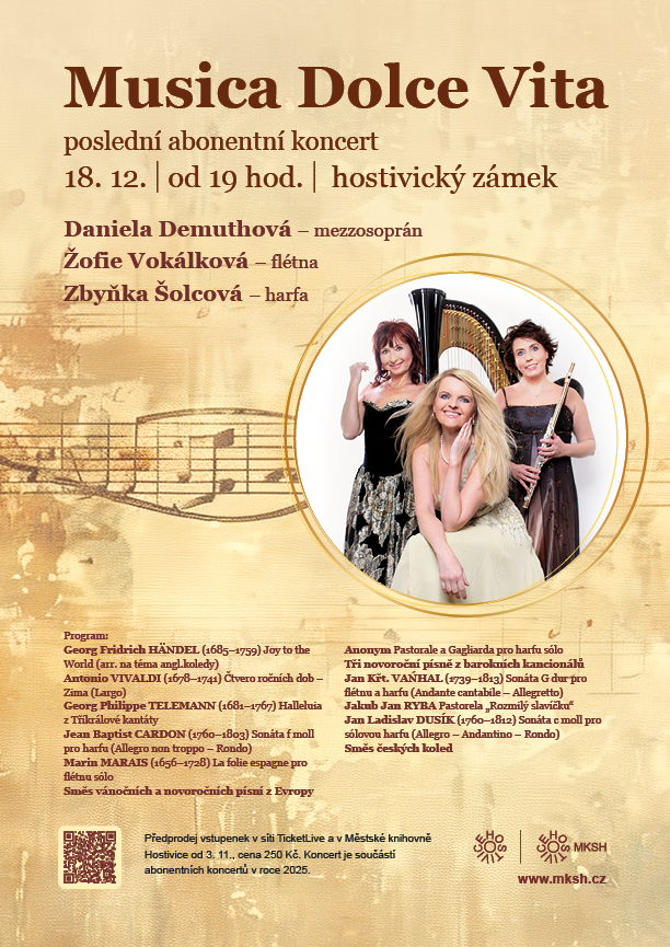 Musica dolce vita - Adventní koncert na zámku v HostivicíchVe čtvrtek 18.12.2025 vystoupila Zbyňka Šolcová s triem Musica dolce vita od 19:00 ve slavnostních prostorách zámku v Hostivicích. Program večera byl sestaven tak, aby vás pohladil po duši a navodil pravou vánoční náladu. Bylo možné se těšit na mistry evropského baroka i klenoty české hudební tradice. Z pera barokních velikánů zazní radostné Joy to the World Georga Fridrycha Händela, mrazivě krásné Largo z Vivaldiho Zimy i chorál Johanna Sebastiana Bacha. Virtuozitu harfy a flétny vám představily sólové i komorní skladby pro harfu od Jeana Babtiste Cardona či Jana Ladislava Dusíka. Flétna se rozezněla v brilantních variacích Marina Maraise. K vánočnímu času neodmyslitelně patřily, skladby Adama Václava Michny, pastorely Jakuba Jana Ryby a v neposlední řadě české i světové koledy.PROGRAM KONCERTU: Antonio VIVALDI (1678 – 1741): Čtvero ročních dob – Zima (Largo) Georg Fridrich HÄNDEL (1685 – 1759): Joy to the World (arr.na téma anglické koledy) Johann Sebastian BACH (1685 - 1750): Chorál „Jesus bleibet meine Freude“ z kantáty 147 Marin MARAIS (1656 – 1728): La folie espagne pro flétnu sólo Jean Baptist CARDON (1760 – 1803): Sonáta f moll pro harfu (Allegro non troppo - Rondo) Směs evropských koled Anonym: Pastorale pro harfu sólo Adam Václav MICHNA (cca 1600 - 1676): Vánoční magnét a střelec Adam Václav MICHNA (cca 1600 - 1676): Vánoční noc Adam Václav MICHNA (cca 1600 - 1676): Vánoční roztomilost František BENDA (1709 – 1786): Sonáta F dur pro flétnu a harfu Jakub Jan RYBA (1765 - 1815): Pastorela „Rozmilý slavíčku“ Jan Ladislav DUSÍK (1760 – 1812): Sonáta c moll pro sólovou harfu (Allegro - Andantino - Rondo) Několik českých koled