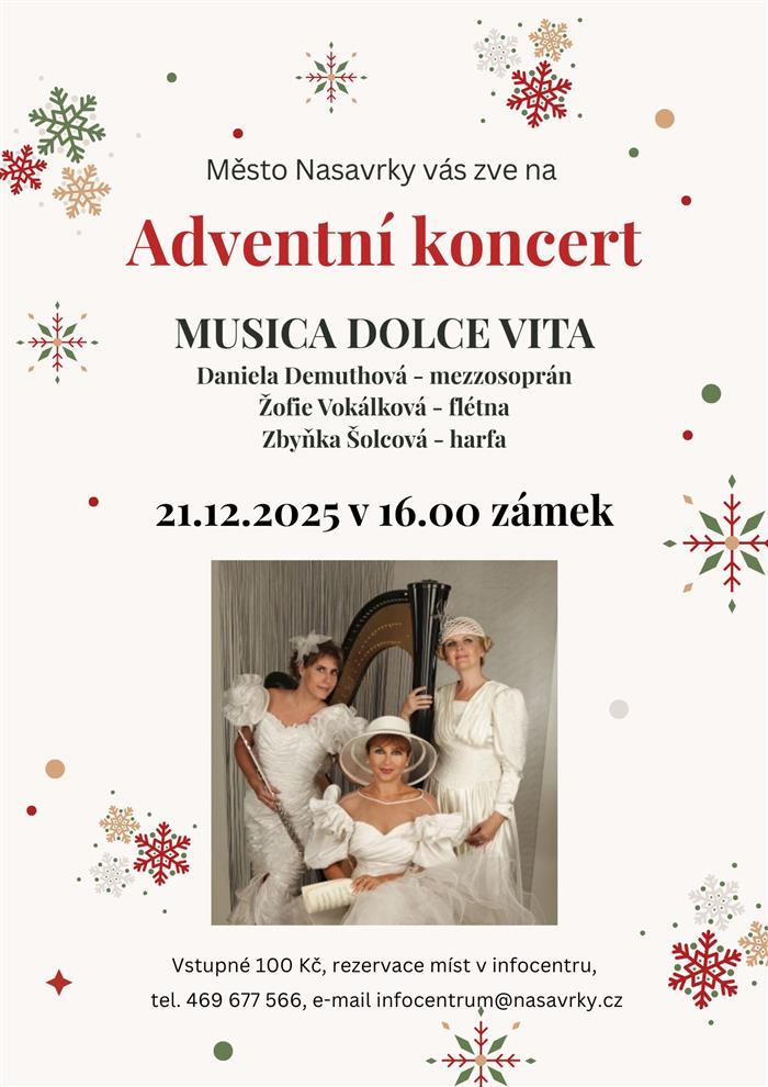 Musica dolce vita - Adventní koncerty v Nasavrkách a v TřemošniciV neděli 21.12.2025 vystoupila Zbyňka Šolcová s triem Musica dolce vita se dvěma adventními koncerty, a to od 16:00 na zámku v Nasavrkách a od 18:30 v prostorách obřadní síně v Třemošnici. Program večera byl sestaven tak, aby vás pohladil po duši a navodil pravou vánoční náladu. Bylo možné se těšit na mistry evropského baroka i klenoty české hudební tradice. Z pera barokních velikánů zazní radostné Joy to the World Georga Fridrycha Händela, mrazivě krásné Largo z Vivaldiho Zimy i chorál Johanna Sebastiana Bacha. Virtuozitu harfy a flétny vám představily sólové i komorní skladby pro harfu od Jeana Babtiste Cardona či Jana Ladislava Dusíka. Flétna se rozezní v brilantních variacích Marina Maraise. K vánočnímu času neodmyslitelně patří skladby Adama Václava Michny i pastorely Jakuba Jana Ryby a v neposlední řadě české i světové koledy.PROGRAM KONCERTŮ: Antonio VIVALDI (1678 – 1741): Čtvero ročních dob – Zima (Largo) Georg Fridrich HÄNDEL (1685 – 1759): Joy to the World (arr.na téma anglické koledy) Jean Baptist CARDON (1760 – 1803): Sonáta f moll pro harfu (Allegro non troppo - Rondo) Marin MARAIS (1656 – 1728): La folie espagne pro flétnu sólo Směs evropských koled Anonym: Pastorale pro harfu sólo Adam Václav MICHNA (cca 1600 - 1676): Vánoční magnét a střelec Adam Václav MICHNA (cca 1600 - 1676): Vánoční noc Adam Václav MICHNA (cca 1600 - 1676): Vánoční roztomilost František BENDA (1709 – 1786): Sonáta F dur pro flétnu a harfu Jakub Jan RYBA (1765 - 1815): Pastorela „Usni malé poupátko“ Jan Ladislav DUSÍK (1760 – 1812): Sonáta c moll pro sólovou harfu (Allegro - Andantino - Rondo) Několik českých koled
