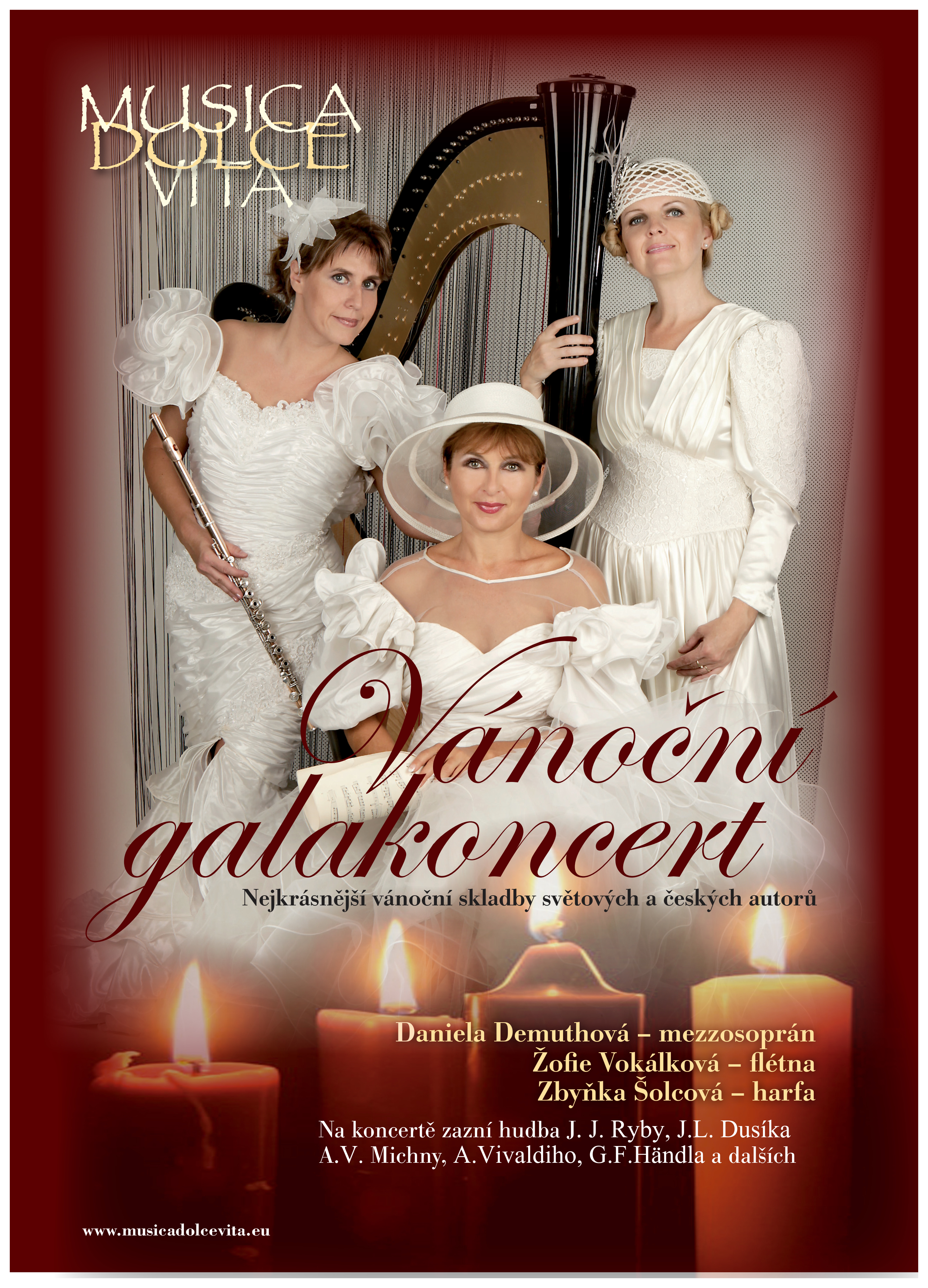 Novoroční galakoncert v Polici nad MetujíVe středu 8.1.2020 vystoupí Zbyňka Šolcová s triem Musica dolce vita v sále Kolárova divadla v Polici nad Metují. Na programu večera, jehož začátek je v 19:00 hod, je Novoroční galakoncert sestavený z děl slavných světových i českých mistrů, ke kterým patří Johann Christoph Pachelbel, Johan Sebastian Bach, Georg Philipp Telemann, Jean-Baptiste Cardon, Marin Marais, František Benda, Jan Ladislav Dusík nebo Adam Václav Michna z Otradovic. V roce 2020 slaví trio Musica dolce vita 15 let na hudební scéně a program koncertu je sestaven z nejúspěšnějších skladeb za toto období.![]() "Tříkrálový koncert a tři královny" ve Františkových LázníchV pondělí 6.1.2020 vystoupila Zbyňka Šolcová s triem Musca dolce vita od 19:30 v koncertním sále Císařských lázní ve Františkových Lázních v pořadu s názvem "Tříkrálový koncert v podání tří královen". V první části koncertu zazněly skladby slavných evropských skladatelů, ke kterým patří Johann Pachelbel, Georg Philipp Telemann, Antonio Vivaldi, Georg Friedrich Händel, Marin Marais nebo Jean-Baptiste Cardon. Druhá část koncertního programu byla sestavena ze skladeb českých mistrů zastoupených Františkem Bendou, Janem Ladislavem Dusíkem nebo Adamem Václavem Michnou z Otradovic. Trio Musica dolce vita je již po dlouhá léta stálicí na kulturní scéně Františkových Lázní a i v letošním roce speciálně k této příležitosti sestaveným programem přispěl k pohodě a sváteční náladě tříkrálového večera.Lístky do památníku v Jílovém u DěčínaV neděli 5.1.2020 vystoupila Zbyňka Šolcová s triem Musca dolce vita od 17:00 v hlavním sále zámku v Jílovém u Děčína v pořadu s názvem "Lístky do památníku". Také máte doma svůj nebo babiččin památníček plný vzpomínek? Trio Musica dolce vita přináší pořad Lístky do památníku, program plný hudby našich klasiků počínaje Františkem Škroupem, Bedřichem Smetanou či Antonínem Dvořákem. Kromě skvostů české hudby, ke kterým bezesporu patří Smetanova Vltava v úpravě pro harfu Hanuše Trnečka nebo Luisina polka, Dvořákova Humoreska, či známý Valčík D Dur, si vyslechnete i Folprechtovu Malou svitu ve starém slohu, Blodkovo Andante cantabile, písně Leoše Janáčka a Bohuslava Martinů.![]() PŘEJI VŠEM KRÁSNÝ NOVÝ ROK 2020Vánoční koncert v OpočniciV sobotu 28.12.2019 vystoupila Zbyňka Šolcová se sopranistkou Janou Heryánovou-Ryklovou od 16:00 hod v kostele Sv. Cyryla a Metoděje v Opočnici. Program koncertu byl sestaven ze skladeb známých českých i světových autorů pro sólovou harfu i pro soprán a harfu, ke kterým patří Edvard Hagerup Grieg, Adolph Adam, Antonín Dvořák, Franz Schubert, Jakub Jan Ryba, Giulio Caccini, Pietro Mascagni, Wolfgang Amadeus Mozart nebo Giacomo Puccini.![]() Adventní koncert v SezemicíchV neděli 22.12.2019 vystoupila Zbyňka Šolcová s triem Musica dolce vita od 17:00 v sále radnice v Sezemicích. První část "Vánočního koncertu" byla zaměřena na skladby evropských velikánů, ke kterým patří Antonio Vivaldi, Giovanni Battista Bassani, Jean-Baptiste Cardon, Marin Marais, Georg Friedrich Händel, Marcel Grandjany, Sergei Bortkiewicz, Před přestávkou zazněla směs evropských koled v úpravě Jaroslava Krčka.Druhá část koncertu byla zaměřena na hudbu slavných českých mistrů Františka Antonína Rösslera (Francesco Rosseti), Josefa Antonína Sehlinga Jana Ladiskava Dusíka nebo Adama Václava Michny z Otradovic. Závěr koncertu byl již zaměřen na vánoční písně z barokních kancionálů i známé české koledy opět v úpravě Jaroslava Krčka.