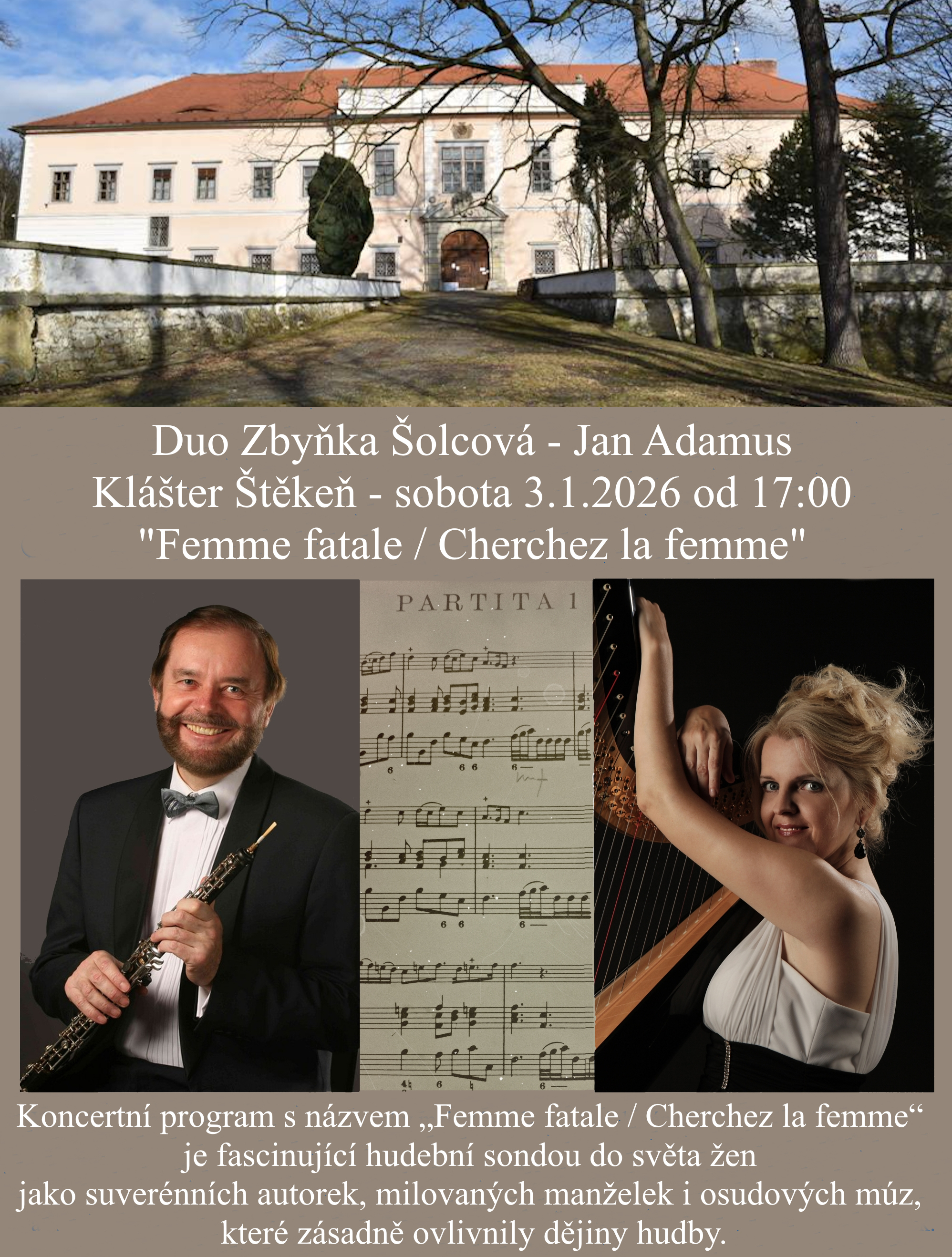 Duo Adamus-Šolcová ve Štěkni "Femme fatale / Cherchez la femme"V sobotu 3.1.2026 vystoupí Zbyňka Šolcová v duu s hobojistou Janem Adamusem od 17:00 v klášteře ve Štěkni. Jedinečný koncert dua Zbyňka Šolcová (harfa) a Jan Adamus (hoboj, anglický roh) s názvem „Femme fatale / Cherchez la femme“ je fascinující hudební sondou do světa žen jako suverénních autorek, milovaných manželek i osudových múz, které zásadně ovlivnily dějiny hudby. Během večera zazní díla barokních mistrů Johana Sebastiana Bacha či Františka Bendy v dialogu s tvorbou výjimečných žen, jako byly Maria Theresia von Paradies, havajská královna Lili‘uokalani nebo virtuózky Anne-Marie Krumpholtzová a Sophie Dusíková. Chybět nebude ani srovnání děl slavných manželských párů, Clary a Roberta Schumannových či manželů Dusíkových, doplněné o soudobé variace Zbyňky Šolcové na téma Almy Mahlerové nebo Marie Theresie von Paradies. Přijďte si vychutnat ušlechtilý souzvuk hoboje a harfy v příbězích o lásce, inspiraci a talentu, který po staletí zůstával ve stínu, aby dnes mohl zazářit v plné kráse.PROGRAM KONCERTU: Johan Sebastian Bach (1685-1750): Sonáta č. 2 pro hoboj a harfu Allegro moderato-Siciliano-Allegro Johan Sebastian Bach (1685-1750): Malá knížka skladeb pro Annu Magdalenu Bachovou Menuet Maria Theresia von Paradies (1759 - 1824) Sicilienne Lydia Kamakaeha "Lili‘uokalani" (1838-1917): .“Aloha Oe“ Wolfgang Amadeus Mozart (1756-1791): Adagio pro anglický roh a harfu Anne-Marie Krumpholtzová (1766 - 1813): Variace na píseň "Robin Adair“ Sophie Dusíková (1775-1831): Sonáta c-moll Allegro - Andantino – Rondo.Allegro Jan Ladislav Dusík (1760-1812): Alegro pro hoboj a harfu Clara Schumann (1819-1896): Polonaise Op.1 No. 2 Robert Schumann (1810 - 1856): Romance pro hoboj a harfu op. 94 Zbyňka Šolcová (1967):.Variace na píseň „Extaze“ od Almy Mahlerové (1879-1964) Zbyňka Šolcová (1967): Fantazie na téma Sicilienne autorky Maria Theresia von Paradies (1759 - 1824) František Benda (1709-1786):.Sonáta pro hoboj a harfu Andante con moto-Moderato-Presto
